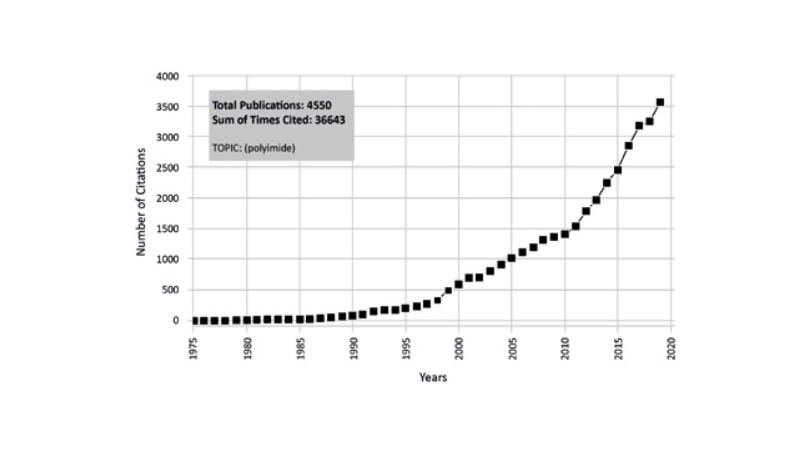 The above graph shows the number of papers regarding polyimide. Source: Researchgate – Number of citations per year from 1975 to 2019, Web of Science.