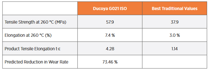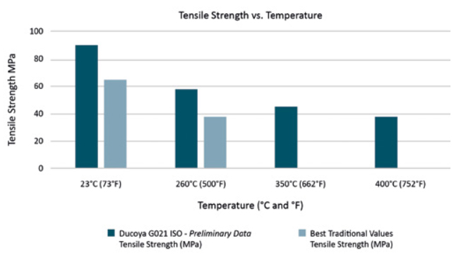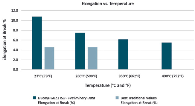 The above graph consists of Ducoya preliminary data – arithmetic mean of five specimens, and best traditional values taken from published datasheets, none of which reported data over 260 °C.